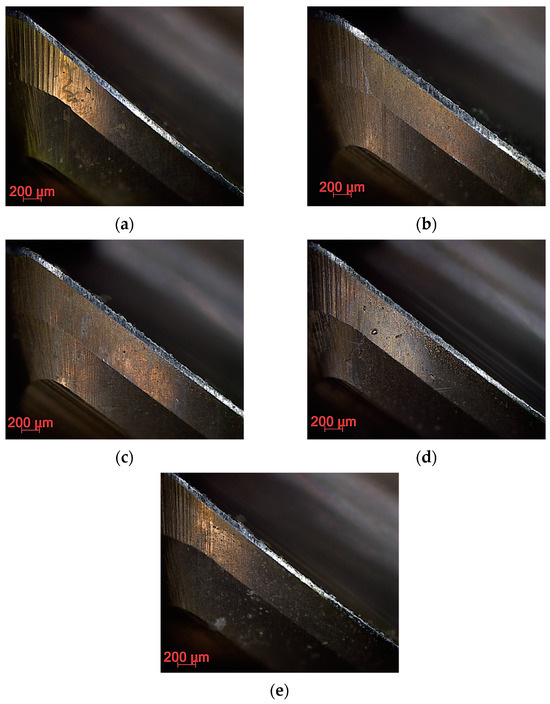 Microscopic images of the tools used at (a) 3%; (b) 6%; (c) 9%; (d) 12%; and (e) 15% oil concentrations.