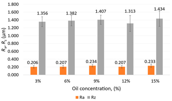Average surface roughness (Ra) and main roughness depth (Rz) as a function of the oil concentration.