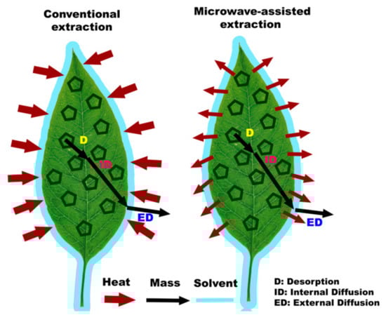 Overall, the mechanism of microwave-assisted extraction involves the application of microwave energy to heat the sample, facilitate the dissolution of solutes into the solvent, and promote the transfer of solutes to the bulk solution through effective diffusion processes [31,32].