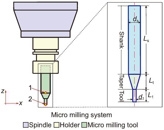 The micro-milling spindle–holder–tool system is divided into the spindle substructure, holder substructure, and micro-milling tool substructure, as shown in Figure 2. The FRFs of the micro-milling cutter in the x direction can be expressed as follows: