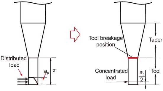 According to Lu et al. [20], the maximum bending stress of a micro-milling cutter occurs at the location of transition between the tool and taper of the micro-milling cutter. In this paper, the maximum bending stress is calculated by simplifying the distributed load on the micro-milling cutter to a concentrated load, which is positioned at a distance of a p /2 from the tip of the cutter, as illustrated in Figure 4.