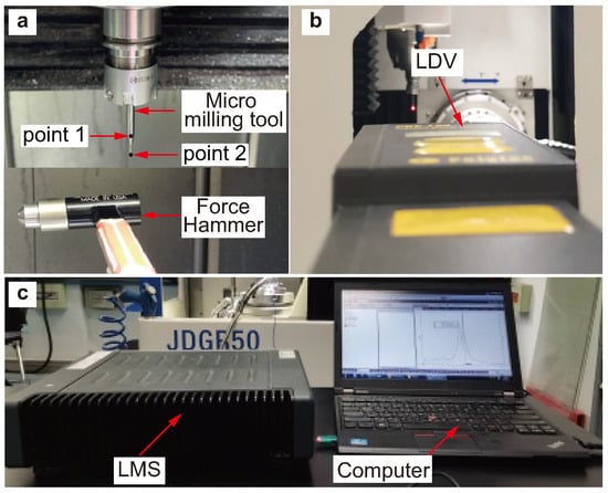 Validation experiments of tool tip FRFs are carried out using a two-fluted micro-milling cutter with a length of 50 mm. The diameters of the shank and tool of the micro-milling cutter are 4 mm and 1 mm, respectively. A commercial LDV (POLYTEC V100) and a force hammer are used to carry out a hammer impact test, as shown in Figure 5. Both excitation and response signals are collected by LMS Test Lab. The LDV is typically positioned on a tripod, which must be leveled to mount the LDV. Subsequently, the LDV is aimed at the object to be measured, and the laser spot is adjusted to be as small as possible based on the distance. Finally, the position of the LDV is fine-tuned to ensure that the signal received by the LDV is strong enough.