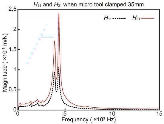 The micro-milling tool is clamped with a length of 35 mm on a 5-axis CNC machine. The geometric parameters of the cutter in Figure 2 are shown in Table 1. The excitation point is point 1 and the response points are points 1 and 2. To ensure result accuracy, each hammer impact test is repeated 15 times, and the final FRFs are determined by averaging these measurements. The direct FRFs of point 1 and cross-FRFs between points 1 and 2 are shown in Figure 6. The FRFs of the micro-tool clamped with a length of 35 mm can be calculated by Equation (6), and the result is illustrated in Figure 7. The proposed method needs to measure the response at the tip of the micro-milling cutter, which is susceptible to interference. Therefore, hammer impact tests may show poor coherence. In this case, a deliberately small excitation force should be used. The excitation generated by this force will only induce vibration in the tool itself, without generating additional signals, ensuring good coherence in the experiments. At the same time, the sensitivity of the excitation and response needs to be adjusted so that smaller physical quantities can be measured. Similarly, tool tip FRFs of a micro-milling tool with a clamped length of 25 mm can be obtained by the same experimental methods, and the results are shown in Figure 8.