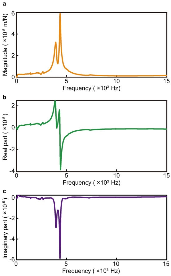 Figure 7. FRFs of tool tip with clamped length of 35 mm. (a) Magnitude. (b) Real part. (c) Imaginary part.