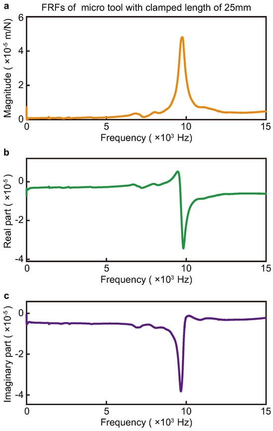 Figure 8. FRFs of tool tip with clamped length of 25 mm. (a) Magnitude. (b) Real part. (c) Imaginary part.