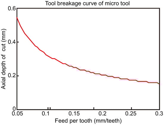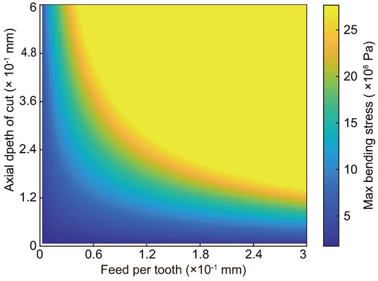 The length of the tool part of the micro-milling cutter is 6 mm. The diameter of the tool is 1 mm. The ultimate bending stress of the micro-tool is 3.3369 × 10 9 Pa. By substituting these data as well as the cutting force coefficients and constants into Equations (8)–(14), the maximum bending stress at the corresponding cutting parameters can be calculated. When the bending stress during cutting reaches 80% of the ultimate bending stress, the tool is considered to be at risk of breakage.