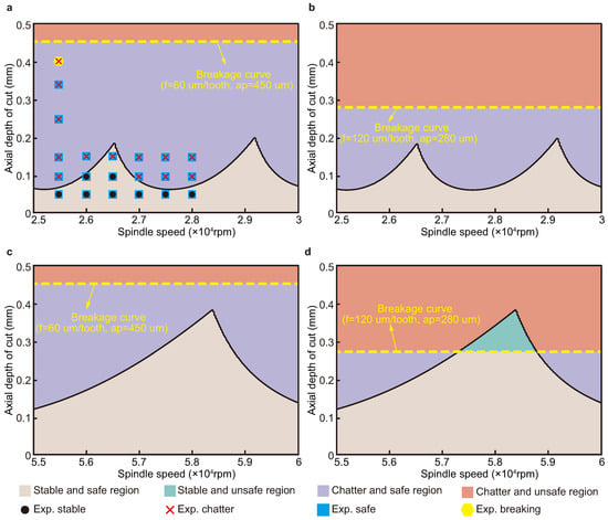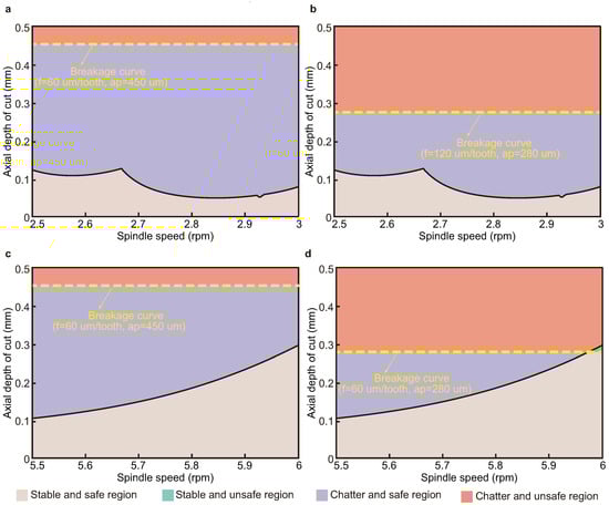 In this paper, the following four regions are defined. The region above the SLDs is defined as the chatter region, while the region below it is defined as the stable region. Similarly, the region above the tool breakage curve is defined as the unsafe region, while the region below tool breakage curve is defined as the safe region. According to these definitions, it can be found that after considering tool breakage, the SLDs, which originally only involve stable and chatter regions, are divided into four regions, i.e., stable and safe region, chatter and safe region, stable and unsafe region, and chatter and unsafe region, as delineated in Figure 11 and Figure 12. In practical cutting situations, unsafe cutting conditions and chatter must be avoided. The ideal situation is the one shown in Figure 11a–c and Figure 12a–c, where all stabilized cutting parameters guarantee safe cutting. The most important case to note is the occurrence of tool breakage in the stable region, which is the blue area in Figure 11d and Figure 12d. The stable cutting region will be split into safe and unsafe regions. The cutting parameters in the unsafe region cannot be used for actual machining, and thus, the occurrence of this situation can also be regarded as a reduction in the stable region. Since the parameters that enable tool breakage in the paper all occur at a spindle speed of 60,000 rpm, the accuracy of the methodology of this paper is demonstrated by using a simulation to simulate tool breakage due to limited experimental conditions. It is worth stating that the tool material and workpiece material will affect the final distribution of the above four regions, and the machining parameters can be selected according to the actual situation.