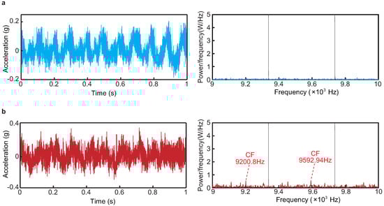 Figure 13. Acceleration signals and power spectrum filtered by VFF−RLS algorithm when the spindle speed is 25,500 rpm and the axial depths of cut are (a) 50 and (b) 150 μ m.