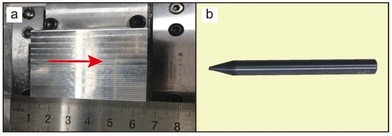 Figure 14. Workpiece and micro-milling cutter used in experiments. (a) Workpiece. (b) Breaking cutter.