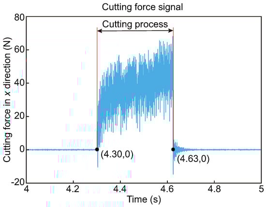 Two of these three cutters are used for static tests and the other one for dynamic tests. The procedure is as follows. The z-coordinate of the surface of the workpiece is defined as 0, and the coordinate of the tip of the first cutter with a clamped length of 35 mm is set to −0.05 mm. Subsequently, the machine feeds in the x-direction with a feed per tooth of 0.001 mm until the tool breaks, with the forces on the workpiece being measured simultaneously. The above steps are repeated to measure the broken force of the second cutter without the loss of generality. To ensure the accuracy of results, cutting experiments are carried out with a feed per tooth of 0.05 mm and an axial depth of cut of 0.3 mm. The tool breakage force is still measured. Ultimately, the measured tool breakage forces corresponding to the three tools are 7.8 N, 7.6 N, and 7.2 N, respectively. The proximity of the three sets of experimental results illustrates the reliability of the experimental results. Substituting the dynamic breaking force into Equation (10), the ultimate bending stress of the tool material is 3.3369 × 10 9 Pa.