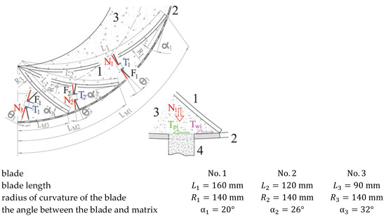 The ratio between the components and and the direction of action of the integral force is given by the geometry of the blade. The blade can be straight or curved. It is important to define its length , radius and the apex angle of the wedge gap . Their interactions then manifest themselves in the form of a measurable quantity, i.e., the extrusion pressure [4,5].