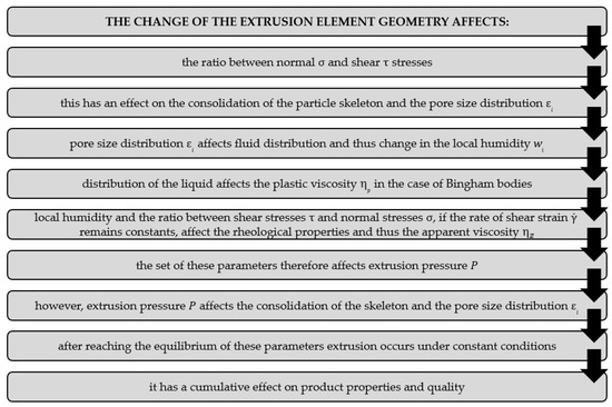 The multiphase composition of the paste creates the preconditions for two approaches to the study of the paste extrusion process. The first is based on the mechanics of particulate matter and considers the paste to be a discrete or semi-continuous environment. It uses experimental procedures of the mechanics of particulate matter. The second approach assumes that the paste is a continuous environment, a continuum. This approach is based on the study of its rheological properties. From the point of view of extrusion, these two principles work simultaneously. First, the granular material is compressed and consolidated in the extruder. This is followed by extrusion through the holes of the die or matrix. This is caused by the effect of a screw or blade. The structure of the grains in the skeleton is reorganized, and the distribution and size of the pores change. At the same time, the tension in the skeleton increases until the yield locus state is reached. At this moment, the granular skeleton is set in motion. However, since the liquid phase is also present, it moves in the pores between the particles. These phenomena are described by the mechanics of particulate matter and are not significantly dependent on the rheological properties of the system [1,2,9,10,22,27,32,33,34].