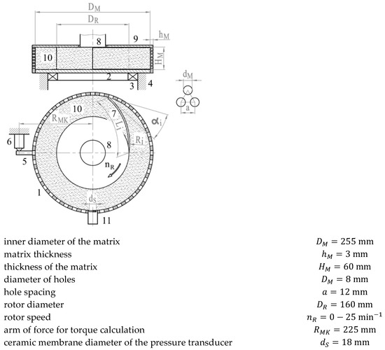 The experiments were performed in an extruder with a cylindrical perforated matrix (Figure 4). The edge of the extrusion blade moved over the surface of the matrix. The device consists of a matrix (1) which is mounted on a plate (2). The plate (2) is on a bearing (3), which is connected to the frame (4). An arm (5) of the plate (2) is supported by a force sensor (6). This configuration allows the measurement of the torque as the result of the shear component of the integral force . For each series of experiments, the configuration with only one blade (7) was used. This blade was placed on a rotor (8), which is driven by a motor gearbox. It allows various speeds to be set. A lid (9) is placed on top of the matrix (1), thus creating a closed chamber in which the paste (10) is located. The matrix (1) is made of a perforated metal sheet of thickness and rolled into a cylindrical shape. The diameters of the holes in the matrix are with distance and the holes are in a triangular configuration. A jig for the location of the pressure sensor (11) is welded on the outer side of the matrix. This sensor has a ceramic membrane of 18 mm diameter. It was used to measure the pressure .