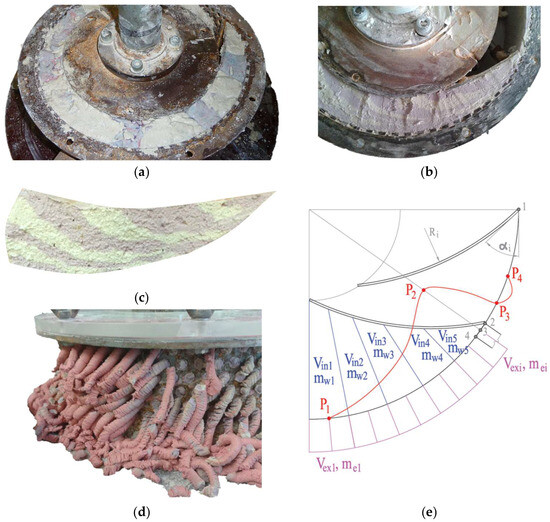 The tested variables were the course of the extrusion pressure distribution under the blade, the moisture distribution of the paste in front of the matrix and behind the matrix , corresponding to the value of pressure and the amount of extrudate . The values with the index refer to the values obtained from the control volumes and (Figure 5e). The five control volumes were defined in the space between the blade and the paste matrix. The additional control volumes were defined for the extrudate. Their number depends on the geometry of the blade. They are defined as the radial projection of the blade length onto the matrix surface. The height of the control volume is , which is the height of the matrix.