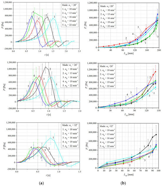 Figure 6a shows the course of the extrusion pressure as it was recorded by the pressure sensor during the motion of the blade, as can be seen in Figure 5e. According to the speed of the rotor , i.e., the circumferential speed of the blade edge at the point of contact with the matrix surface, the length of the pressure profile interval also changes. Such a presentation of the pressure profile is not advantageous. Therefore, the time interval is recalculated to the projection length of the blade on the surface of the matrix in relation to the circumferential speed.
