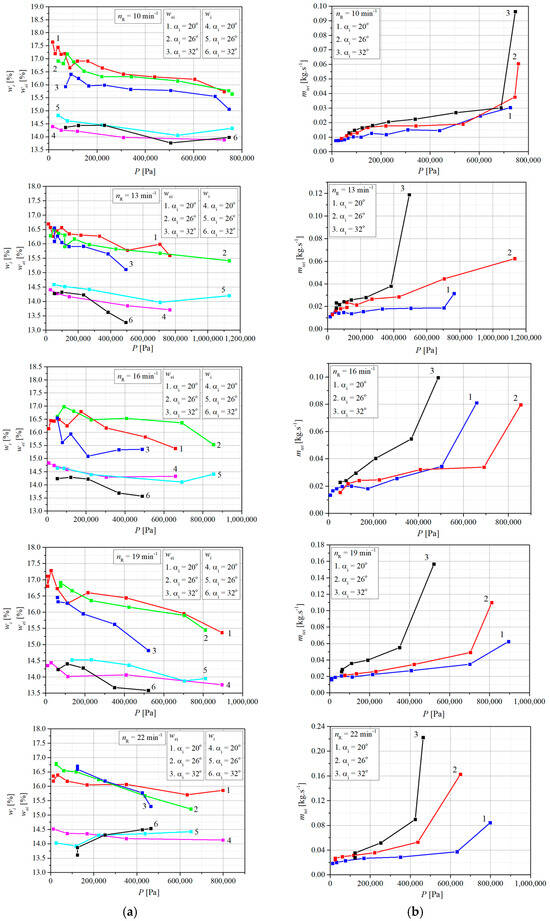 Figure 9a shows the course of the amount of extruded paste behind the die. For the blade with the angle , which is the longest, the samples were taken from 13 control volumes of . For blades with angles and , ten control volumes were provided. From these results, it is difficult to assess the effect of rotor speed with the blade on the amount of extruded material. However, it can be seen that the larger the angle, the greater the variance of the values. This is the absolute amount of extruded material, not the throughput dependent on the rotor speed. Figure 9b indirectly shows the throughput of the paste through the holes in the individual control volumes. The flow speed is hidden in the throughput of the extruder, i.e., the weight of the paste extruded through the holes of the matrix in control volumes per unit time. In this case, the effect of increasing the speed on the flow rate of the paste is evident. The throughput of the extruder increases with increasing blade angle and with increasing speed .
