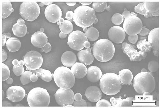 The powder was transported to the powder nozzle by means of a powder feeder via antistatic hoses using a carrier gas flow. The stand-off between the powder nozzle and the substrate was 7 mm. The powder was produced using a gas atomisation process and its particles were mostly spherical, as shown in Figure 1.