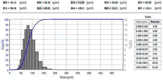Particle size distribution of the powder used for the experiments. Cumulative percentage (Cum%) refers to the proportion of particles smaller than a particular micron size. On the other hand, the term “differential percentage” (Diff%) denotes the proportion of particles that have exactly that micron size.