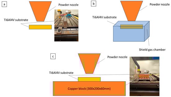 Experimental set-up for the DMD experiments: (a) conventional set-up, (b) with shield gas chamber and (c) with heat sink.