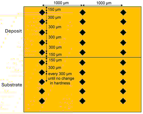 The Qness Q10 microhardness tester was used to measure the microhardness. To obtain a statistically significant hardness measurement across the substrate and the deposit, three microhardness curves were measured. The measurement scheme can be found in Figure 4.