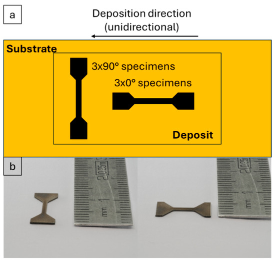 Extraction of micro-tensile specimens through EDM. To determine the directional dependence of the direct metal deposition (DMD) process, samples were machined from the deposit in various orientations. (a) Schematic representation, (b) real specimens.
