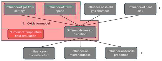 Schematic representation of the methodology. First, the influence of the gas flow settings, travel speed, protective gas chamber and a heat sink on the degree of oxidation was investigated. Based on this, the influence of the degree of oxidation on the microstructure, microhardness and tensile properties was examined. Finally, an oxidation model was developed which, based on a numerical temperature field simulation, showed a way of reducing oxidation.
