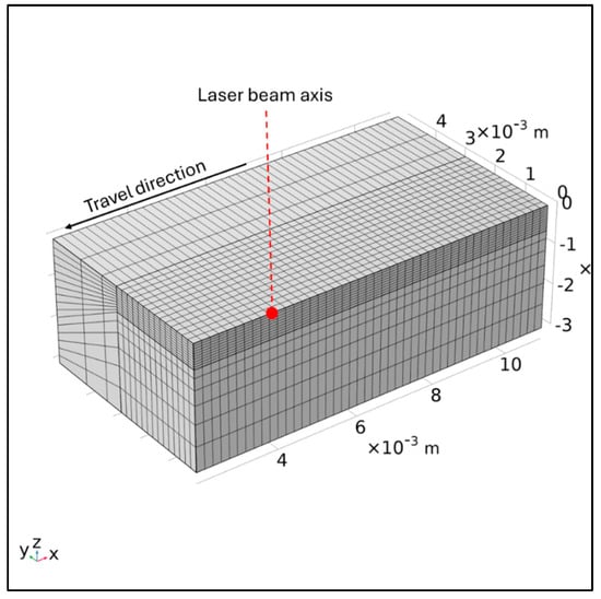 The model domain has a rectangular cross-section with a length of 11 mm, a width of 5 mm and a height of 3 mm. The laser beam is fixed in the model domain at the position x = 4.5 mm and y = 0 mm and applies its energy to the substrate at z = 0 mm. The model domain with the associated coordinate system is shown in Figure 7.