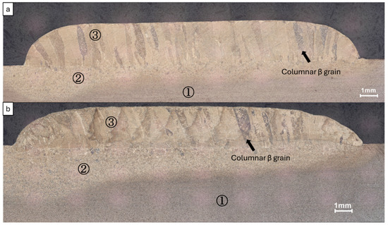 Overview of the microstructure of substrate ①, heat-affected zone (HAZ) ② and build-up ③. (a) Experiment 1 with an oxidation level of 1320 ppm and (b) Experiment 3 with the highest oxidation level of 4920 ppm.