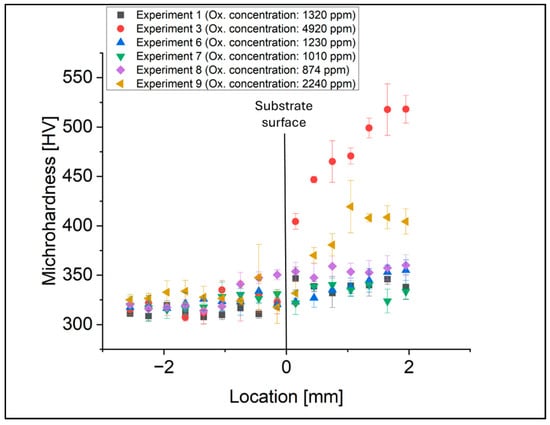Microhardness measurement of the individual experiments with different oxygen contents.