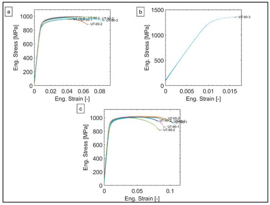 Stress–strain curves for different experiments. (a) Experiment 1, (b) experiment 3 and (c) experiment 4. The engineering stress and the engineering strain could be determined for only one of six tensile tests, as the remaining five tensile specimens of experiment 3 did not show any plastic behaviour and, therefore, it was not possible to create the diagram.