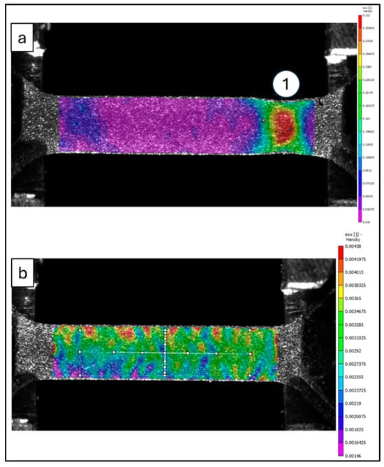 True strain map for various experiments. (a) Experiment 1 and (b) experiment 3. Experiment 1 shows a present necking ①, whereas experiment 3 does not and is a sign of a brittle fracture.