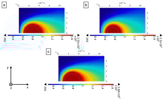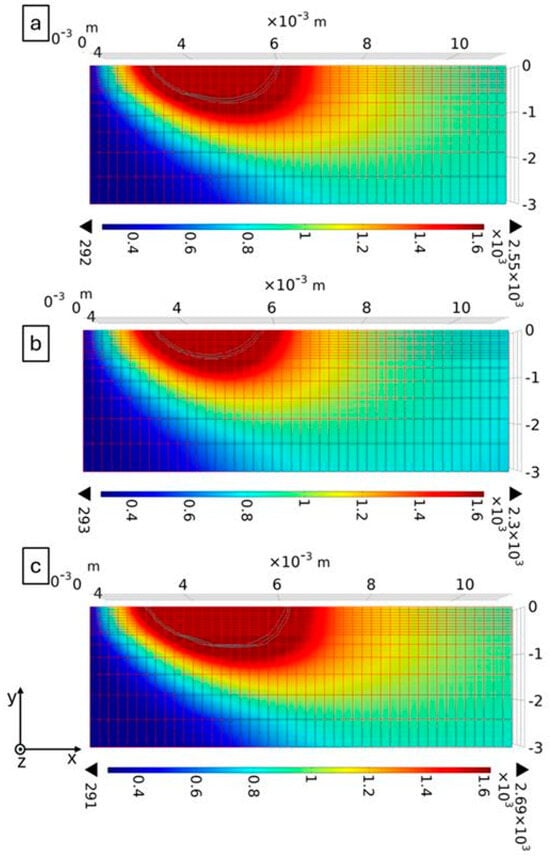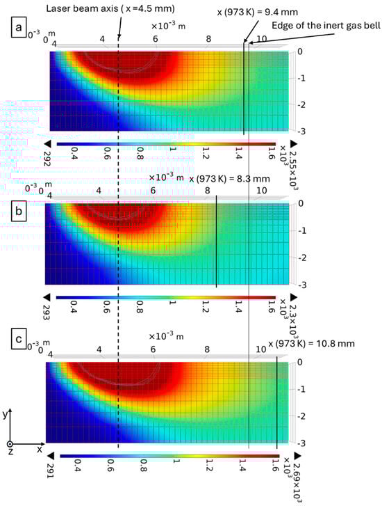 Figure 17 indicates that the temperature fields of the experiments with 1100 W and 720 mm/min travel speed and 797 W and 510 mm/min are not oxidation-critical, as the critical oxidation temperature of 700 °C for Ti6Al4V lies within the inert gas bell in these experiments (Figure 17a,b). In contrast, in the experiment with 1268 W and 830 mm/min, the critical oxidation temperature is outside the inert gas bell and the material oxidises strongly (4100 ppm without heat sink and 2240 ppm with heat sink, as described in Section 2). In contrast, the experiments in Figure 17a,b show an oxygen content of 1320 ppm and 874 ppm. This demonstrates the validity of the assumption of a critical oxidation temperature of 700 °C, which, together with the spatial specification of the oxygen gradient, results in a simple, geometric oxidation model. If the mathematical relationship below is not met, the process is not critical for oxidation.