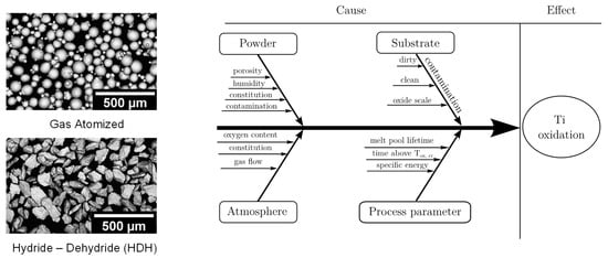 - The powder: The powder has a different degree of oxidation depending on the manufacturing process. With an equivalent diameter, a spherical shape has the lowest surface energy. This leads to a reduced surface area and thus to a reduced oxide layer on the powder compared to the blocky powder, whose structure is based on the hydride–dehydride (HDH) process. Hot carrier gas extraction measurements showed a degree of oxidation that was increased by a factor of two. The spherical powder produced by the gas atomisation process used in this work has an oxygen content of 500 ppm, whereas the HDH powder has an oxygen content of 1000 ppm.