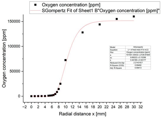 In order to specify the second boundary condition more precisely, the measured oxygen concentration distribution of the coaxial nozzle from Keller et al. [22] was used. To obtain a function of the boundary oxygen concentration, a regression was carried out which fits the data points with a high degree of agreement (R2 = 0.995). The data points, as well as the fitting function, can be seen in Figure 18.