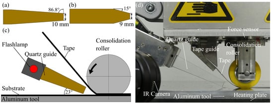 The consolidation force was measured using a multicomponent sensor with an accuracy of 4 N and a resolution of 0.2 N. A hygrometer is used to measure room temperature and humidity. It was placed right next to the ATP rig and the material storage. The hygrometer has an accuracy of ±0.5 °C and a resolution of 0.1% for the temperature measurement, whereas the humidity can be measured with an accuracy of ±3% and a resolution of 0.1%. All placement trials were performed with a Heraeus humm3 flashlamp system as heating source (see Figure 1c). The quartz guide has an angle of 23° to the substrate and a width of 30 mm. Two different chamfered quartz guides were used in this study. Figure 1a shows the geometry of a chamfered quartz guide with one radiating surface, and Figure 1b shows the geometry with three radiating surfaces. The configuration of the quartz guide in the processing environment is shown in Figure 1c,d. All tapes were placed directly on the aluminum tool. The tool was heated to 50 °C to ensure equal placement conditions for all trials. The lay-up speed was set to 50 mm/s, and the consolidation force was set to 500 N for all tests.