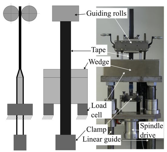 The bonding quality of composite laminates are typically characterized by the crack propagation resistance with Double Cantilever Beam (DCB) tests for mode I and End Load Split (ELS) for mode II crack initiation []. Another common test method for evaluating of the bonding strength is the Short Beam Strength (SBS) test [,,,,]. High-performance thermoplastics can be tested with SBS and show valid failure modes []. However, it was shown by Schaefer [] that SBS tests on CF/PA6 result in wrong values, because the samples did not experience interlaminar crack formation and failed due to plastic shear. Stokes-Griffin et al. [] also listed poor fiber–matrix bonding as a possible contributing factor for the failing test. Wedge peel tests have been widely used [,,,] to compare the interlaminar bonding of different composites and are an alternative to SBS or DCB tests for the evaluation of the bonding strength, as they show good correlation with DCB tests []. Although it is not yet standardized for this kind of test, wedge peel testing is conceptually comparable to standardized tests for adhesive bonding, e.g., ASTM D3762. The wedge peel test is able to continuously test the bonding strength over the whole sample length and is therefore suitable to identify any differences in bonding strength occurring from process conditions. Due to the noncontinuous heating behavior of the flashlamp system, different bonding levels over the length of the tape can occur. The peel test setup used for this study is shown in Figure 2. It consists of a wedge with a thickness of 10 mm and a wedge angle of 40°. The tip of the wedge is rounded and has a radius of 0.5 mm. All surfaces of the wedge have a mean roughness depth (difference between peak and valley height) of = 0.63 m. The tapes are pulled over the wedge with the interface in between the second and third ply. The peel speed was set to 1 mm/s. The peel force is measured by two load cells (located underneath the peel wedge) with a capacity of 300 N and a resolution of 0.009 N at an acquisition rate of 10 Hz. The sample width was measured with a caliber at 10 points (same positions for each tape on the third layer) and averaged to calculate the arithmetic mean of the tape width. The digital caliber has a measurement accuracy of 0.03 mm.