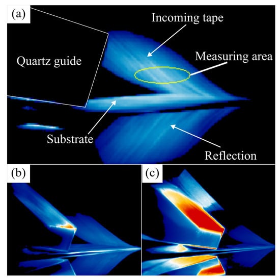 Figure 3a shows the third layer of a tape placed at 50 mm/s onto two other tapes forming a substrate. The evaluation area for the temperature measurement is shown with a yellow ellipse. All data were collected with an acquisition frequency of 250 Hz. An uneven heat distribution across the tape width can be seen in the Figure, as well as an uneven heat distribution along the tape length. Figure 3b,c show thermographs with a chamfered quartz guide, as shown in Figure 1b. It can be observed that the matrix residue of the tape was collecting on the chamfered sides of the quartz guide due to the tape touching the quartz guide during the end phase of the placement. This led to different heating characteristics in the subsequent tapes. The chamfered quartz guides led to a high variability in temperature over the tape length with increasing amounts of residue buildup. Figure 3c shows the quartz guide heating up to over 400 °C, which led to a heating of the tape right after exiting the guiding system and a lower temperature in front of the nip point compared to Figure 3b. The geometries with chamfered sides were found to be more sensitive to residue buildup on the quartz guides. The geometry in Figure 1a was therefore been chosen for all further experiments.
