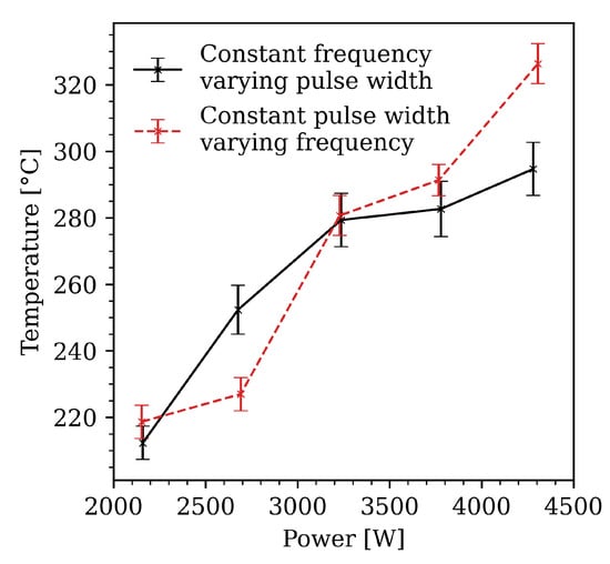 Process temperature for all power settings used in this study for constant frequency with varying pulse width (solid curve) and constant pulse width and varying frequency (dashed curve).