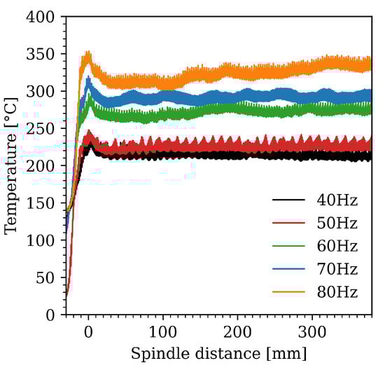 Figure 5 shows the temperature evolution over the tape length section relevant for the subsequent wedge peel tests for the tapes placed at a constant pulse width with varying frequency for one tape each. The spindle position 0 mm was at the beginning of the bonding between the tapes shortly after the start of the placement when the temperature reached a temperature level high enough to bond the tapes together. It can be seen that the temperatures for the experiments at 40 Hz and 50 Hz were closer to each other compared to the other values. The first peak in the temperature can be explained by the startup of the placement with the tape being closer to the quartz guide and therefore having a higher temperature. The temperature evolution for the experiments at 60 to 80 Hz showed higher variability within the peel test length. The 80 Hz sample showed the highest variability and increasing temperature over the peel test length, which could lead to different bonding within the tape over the length of the placement.