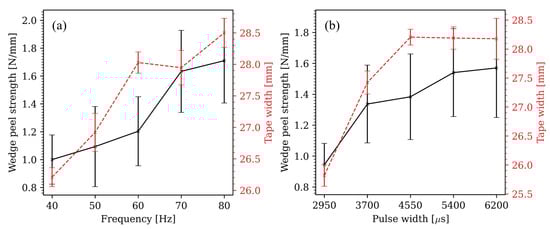 (a) Effects of the frequency on the wedge peels strength and the tape width. (b) Effects of the pulse width on the wedge peels strength and the tape width.