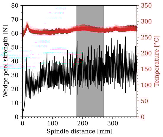 In order to determine the associated temperature of the incoming tape for the parameter combinations shown in Table 1, a series of tapes was placed onto the aluminum tool to form a laminate. The temperatures were measured on the incoming third layer due to the tapes being pulled apart between the second and third layer for the wedge peel test. The temperature of the incoming tape was measured using an InfraTec Image IR 8300 IR camera. The IR camera has a detector format of 640 × 512 pixels with a temperature resolution of 0.025 K at 30 °C. The camera uses a lens with 25 mm focal length. The ni-point temperature cannot be measured directly with the IR camera. Combinations of surface emittance and specular reflections of the opposing surfaces near the nip point distort the temperature measurement []. Therefore, the temperature was measured closely before the nip point. It needs to be noted that the temperature could differ from the actual processing temperature, because it is not measured directly at the nip point. The emissivity was set to 0.91, as the values typically range from 0.8 to 0.95 depending on the material and the geometrical configuration of the setup [].