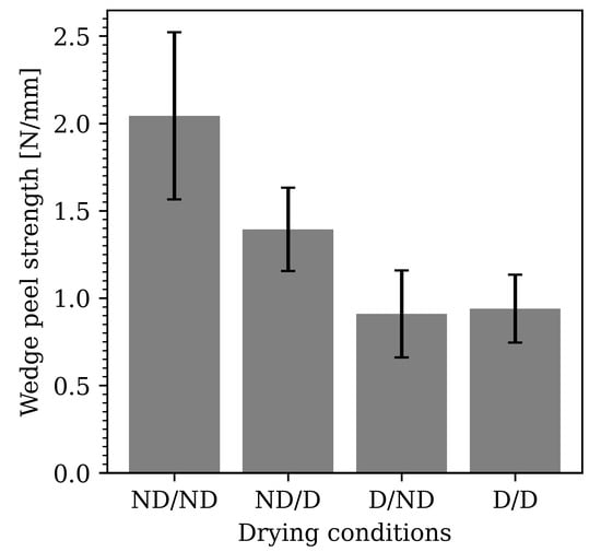 The results can be seen in Figure 8. The ND/ND samples had the highest peel strength (2.04 N/mm), whereas the samples dried before the placement showed a significant reduction in peel strength resulting in a peel strength of around 0.9 N/mm. This is to be expected, because moisture acts as a plasticizer in the polymer. Plasticizers decrease the and and provide chain mobility by reducing the secondary forces between the macromolecules. This effect results in a decrease in tensile strength, hardness, or elastic modulus while increasing the elongation at break or toughness []. Those effects results in a more ductile crack propagation compared to dry samples []. Samples not dried before the placement but dried before the peel test also showed a reduction in peel strength, but it was not as drastica compared to the samples dried before the placement. The peel strength for those samples reached an average level of 1.39 N/mm.