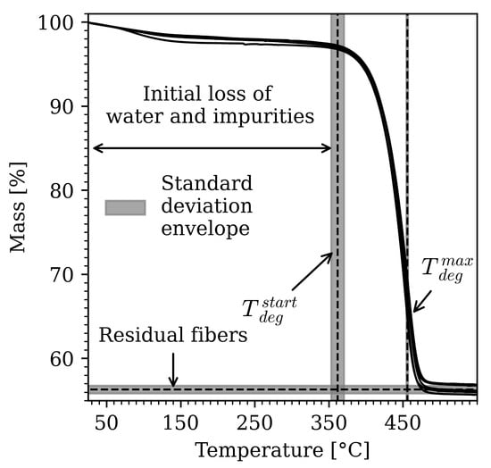 Thermal degradation deteriorates the polymer matrix by cutting the molecular chains by rupture or scission []. During ATP, heating rates of 500 °C/s can occur. However, the exposure to high temperature levels is usually very short (<0.2 s) [,]. Figure 9 shows the results from TGA tests on five composite material samples. The onset of degradation was annotated at around 362 °C and was set at a weight loss of 3%, because PA6 absorbs around 3 m% of water at standard conditions (23 °C and 50% humidity) []. These results were verified by measuring 17 tapes with the moisture analyzer. The tapes have been kept at a humidity of 43% and a temperature of 22 °C. All tapes were dried for 7 min at a temperature of 120 °C with the halogen lamp of the moisture analyzer. The tapes lost 2.73 m% water on average with a standard deviation of 0.11 m%. The degradation temperature for PA6 was found by other researchers at around 350 °C [] to 400 °C [], and the material was fully decomposed at around 500 °C [] to 530 °C [] in a nitrogen atmosphere. A temperature above 390 °C was shown to lead to a more intense degradation (the degradation took place faster) []. The water loss took place from the start of the measurements (25 °C) to the degradation point. A faster mass loss was seen from the start to around 150 °C. After this point to the degradation point, a slower loss was observed (around 1% mass loss from 150 °C to 360 °C). The degradation temperature was determined after the loss of all water (around 3 m%). This yielded a degradation temperature of 361.8 °C with a standard deviation of 8.6 °C. After the initial mass loss due to the absorbed water, the matrix degraded from 361.8 °C to around 500 °C, thus leaving around 56.3 m% (standard deviation of 0.5 m%) carbon fibers behind (at a temperature of 550 °C). The fiber mass content was 2.3 m% higher compared to the data sheet of the material. Slight deviations in the degradation temperature between the samples were observed. The fastest degradation was found at 455.8 °C with a standard deviation of 1.0 °C. The results from Hanna [] verify the decomposition stages found in this study: At temperature levels up to 150 °C, the matrix was loosing absorbed water, which resulted in a small weight loss of about 2%. The second stage ranged from 280 to 450 °C, where the PA6 was getting decomposed, and above 450 °C, were the impurities and undecomposed PA6 were lost. A higher degree of crystallinity was found to lead to faster decomposition at higher temperature. A higher activation energy is needed at higher crystallinity to break the crystalline parts [].