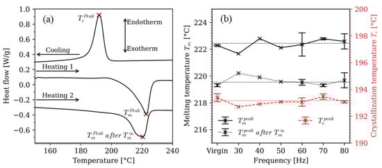 (a) DSC heating and cooling cycles for different heating system frequencies (Heating cycle 1 offset by 0.4 W/g for better visualization). (b) Melting temperature before and after cycling to the melting point of the infinite crystals, as well as crystallization temperature (all temperatures are peak values).