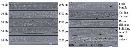 Figure 11 shows cross-sections of polished samples from different heating system parameter variations (corresponding to the values in Table 1) around 300 mm from the start of the lay-up. The cross-sections were used to evaluate the homogeneity of the laminates and not to analyze any damages resulting from the placement. All images were taken with a digital microscope from Keyence (VHX-7000) at a magnification of 150×. At the lower power levels (to around 3229 W) of the tapes with constant pulse width, the individual tapes of each layer can be clearly distinguished, whereas the layers of the tapes with constant frequency cannot be clearly separated from 2676 W upwards. This corresponds to the peel strength values shown in Figure 6. The clearly separable samples show lower wedge peel strength (<1.3 N/mm). At higher wedge peel strengths, the different states of inhomogeneity of the tape became less visible. The thickness of the samples was measured with ImageJ over 25 points across the tape width. The thickness of the tapes with a constant pulse width showed a linear trend of decreasing thickness with increasing frequency. The tape with 40 Hz had a average thickness of 0.796 mm with a standard deviation of 0.011 mm, whereas the tape placed with 80 Hz had a thickness of 0.651 mm with a standard deviation of 0.015 mm. The thickness of the tapes placed with constant frequency showed more variation and no linear trend. The tape placed with 2950 s had a thickness of 0.765 mm and a standard deviation of 0.013 mm, whereas the tape placed with 6200 s had a thickness of 0.675 mm and a standard deviation of 0.025 mm. A full overview of the measured tape thickness is shown in Table 3. The reduction in thickness is attributed to the higher processing temperature and matrix squeeze-out due to lower matrix viscosity at elevated temperature. The fluctuation of the thickness with increasing temperature can be explained with uneven tape thickness and varying temperature during the placement due to the pulsing operation of the system and nonuniform fiber volume fraction along the tape. Another possible explanation for the varying thickness reduction in the samples with constant frequency could be due to a higher matrix viscosity compared to the samples with varying frequency. Higher frequencies could lead to a higher excitement of the molecular chains and thus reducing the London dispersion forces, which reduces the matrix viscosity []. Moreover, a shift in frequency could also leads to a shift in wavelength, which could result in a better absorption of the energy emitted from the light source by the molecules.