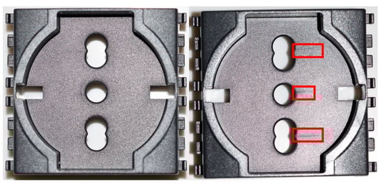 Conversely, the part used to obtain the target dataset was a cover of an electrical socket (part or component 2). These parts were manufactured using the same black polycarbonate employed for part 1 (Makrolon 2405, Covestro, Leverkusen, Germany). Also, on the cover, aesthetic defects were apparent due to the black color of the part and its surface opacity. In this case, weld lines are the most challenging defects to eliminate. Figure 2 shows a photo of component 2 with a weld line defect (right) and without defect (left).