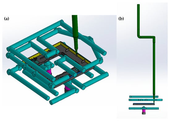 CAD model including part, hot runner system, and cooling channels: (a) Detailed view of the part and insert’s cooling channels, (b) overview of part, cooling channels, and hot runner system.