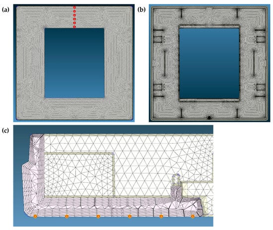 The artificial dataset for part 1 comprises 90 points, each obtained from individual simulations. Process parameters were systematically varied within these simulations using a Latin hypercube sampling (LHS) design of experiments. For this study, five key process parameters were considered: mold temperature (T_mold), injection speed (Vinj), packing pressure (Ph), switch-over point (so), and nozzle temperature (T_no). These parameters were selected based on operators’ frequent variation during the iterative machine setup process. In Figure 4, the mesh morphology in the region where the weld line formed can be observed.