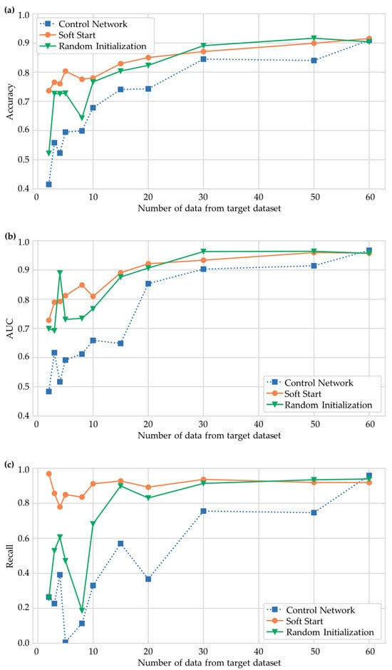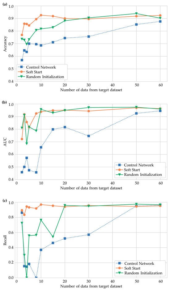 Result of transfer learning between synthetic data of part 1 and experimental data of part 2. Evolution of (a) accuracy, (b) AUC, and (c) recall as the number of experimental data used in fine-tuning training increased.