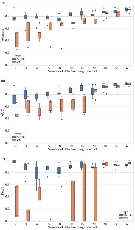 From Figure 7, it is evident that the average performance of the pre-trained model was superior to that of the CN, and the variability of the results was lower in the pre-trained model. This observation becomes particularly pronounced when considering the AUC and Recall metrics. These metrics showed high variability due to the inconsistent training outcomes of the control network. Specifically, when the number of transfer data points was limited, the control network produced a constant output equal to the majority class. This compromised the value of recall and AUC and underscored an additional advantage of TL application.